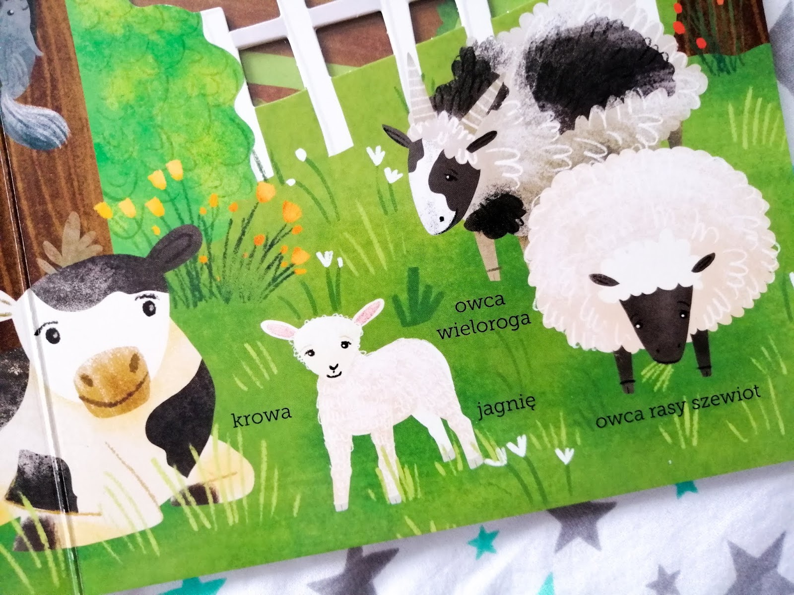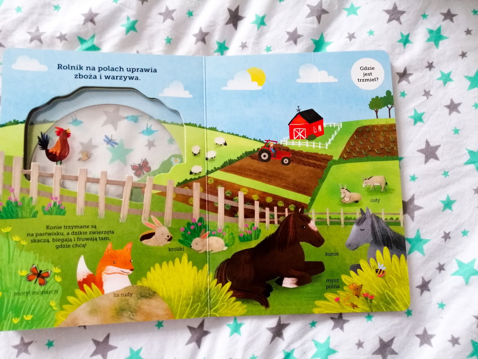 „Na Farmie” zabiera małego czytelnika na wieś. Na kolejnych stronach można wypatrzeć różne zwierzęta, pola, stodołę czy traktor. Każdy mieszkaniec farmy jest podpisany, co ułatwia ich poznawanie.