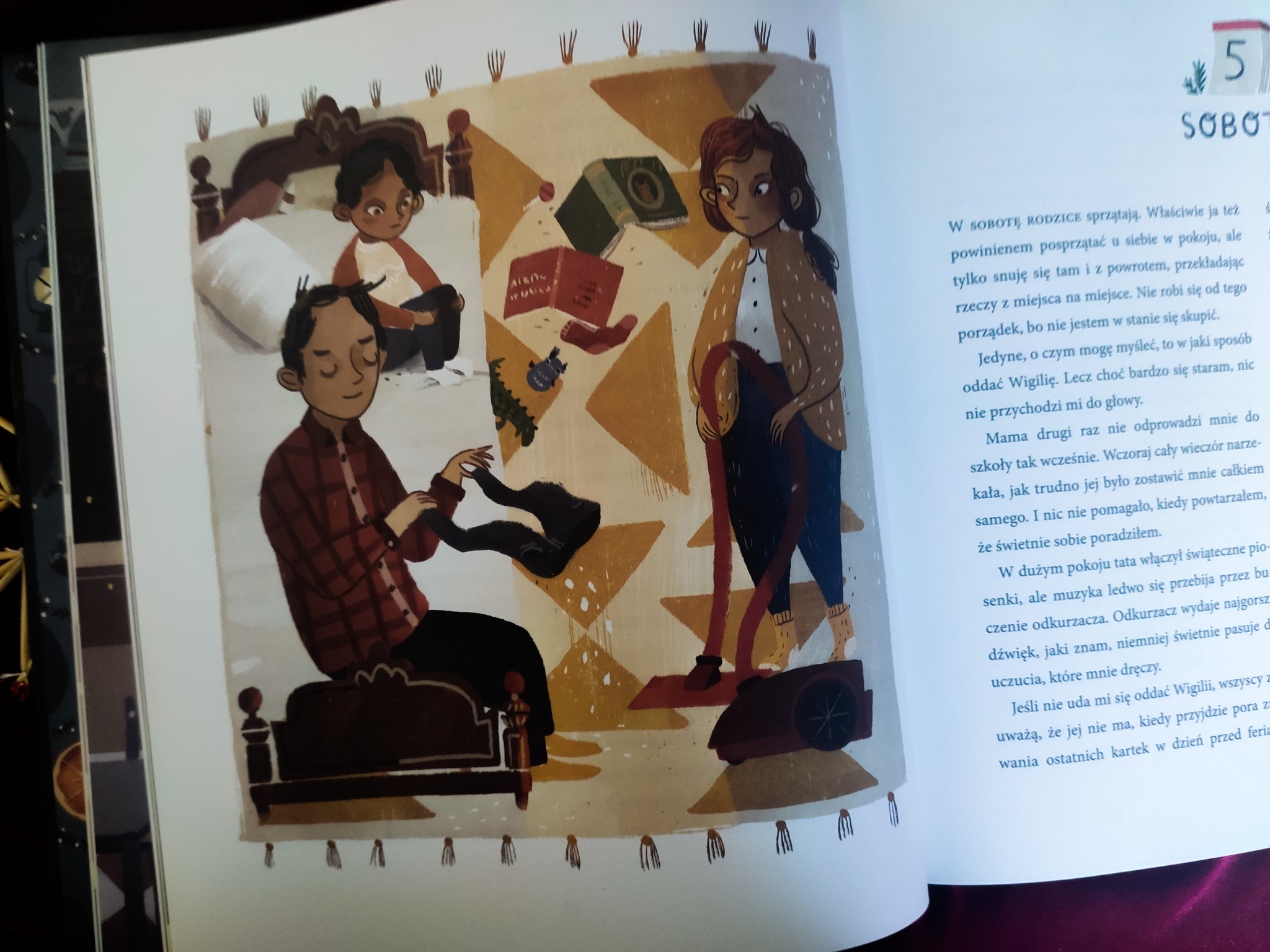 Jak ratowaliśmy Wigilię” to piękna książka. Już w tamtym roku miałam możliwość czytania Adwentowej książki. Na czym to polega? Uważam, że takie wydanie kalendarzy adwentowych jest najlepsze, bo angażuje naszą wyobraźnię i ćwiczy cierpliwość. Każdy rozdział książki, czytamy jednego dnia. „Jak ratowaliśmy Wigilię”, rozpoczyna się 1 grudnia, a kończy 25 grudnia (autorka dodała jeszcze jeden rozdział, którego akcja rozgrywa się pierwszego dnia po feriach świątecznych).