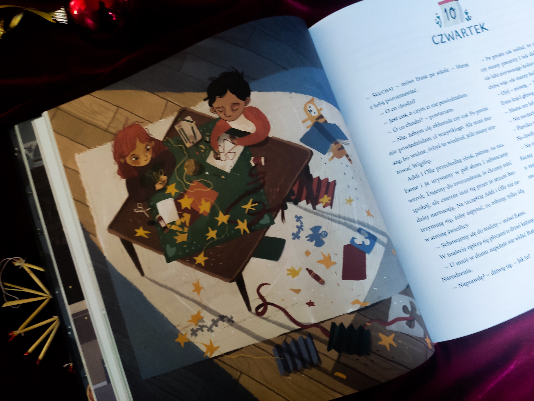 Tim jest sympatycznym chłopcem, a jego emocje oddane są bardzo wiernie. Szczególnie uderzyły mnie te fragmenty, kiedy kartka z datą Wigilii, ginie. Nie będę wam zdradzać dokładnie, jak to się wydarzyło, ale bardzo mnie to uderzyło. Książka Ellen Karlson to opowieść trzymająca w napięciu, ale także aż wypływa z niej ciepło, miłość, wsparcie. Czytając tę lekturę, nie sposób się nie uśmiechnąć. Dodatkowym plusem jest wydanie książki. Tylko spójrzcie na te szczegóły oraz przepiękne ilustracje, od których nie można oderwać wzroku.