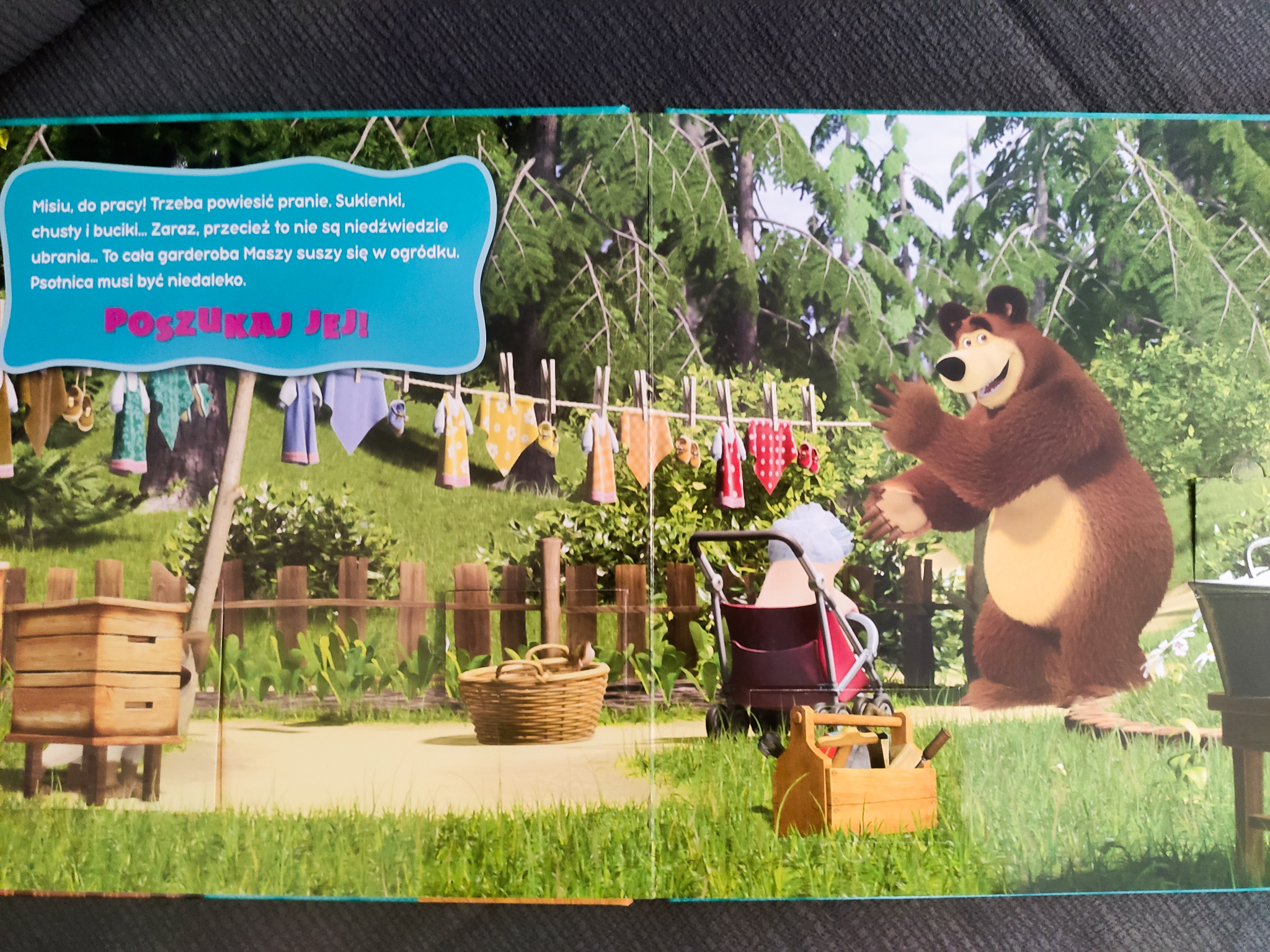 Dzieci kochają okienka – fascynuje i intryguje je to, co schowane. Ktokolwiek wymyślił takie pozycje, powinien dostać jakąś nagrodę. „Masza i Niedźwiedź. Książeczka z okienkami” to pozycja, która zajmuje mojego syna na długi czas. Nie tylko ze mną korzysta z tej książeczki, ale również sam już zna ją na tyle dobrze, że siada i szuka Maszy. Właśnie na tym polega cała zabawa – na poszukiwaniu małej, psotnej dziewczynki, która na każdej stronie się chowa z wyjątkiem pierwszej scenki, chowa się przed czujnym okiem czytelnika. Nasza bohaterka się nudzi, a przyjaciele, gdy ją widzą, sami się chowają. Na kolejnych stronach przenosimy się do ogrodu i domu Niedźwiedzia, a także nad staw. Mały czytelnik ma za zadanie odnaleźć dziewczynkę. Każda strona ma jakąś dodatkową historyjkę, którą dziecko, po pewnym czasie, zna bardzo dobrze.