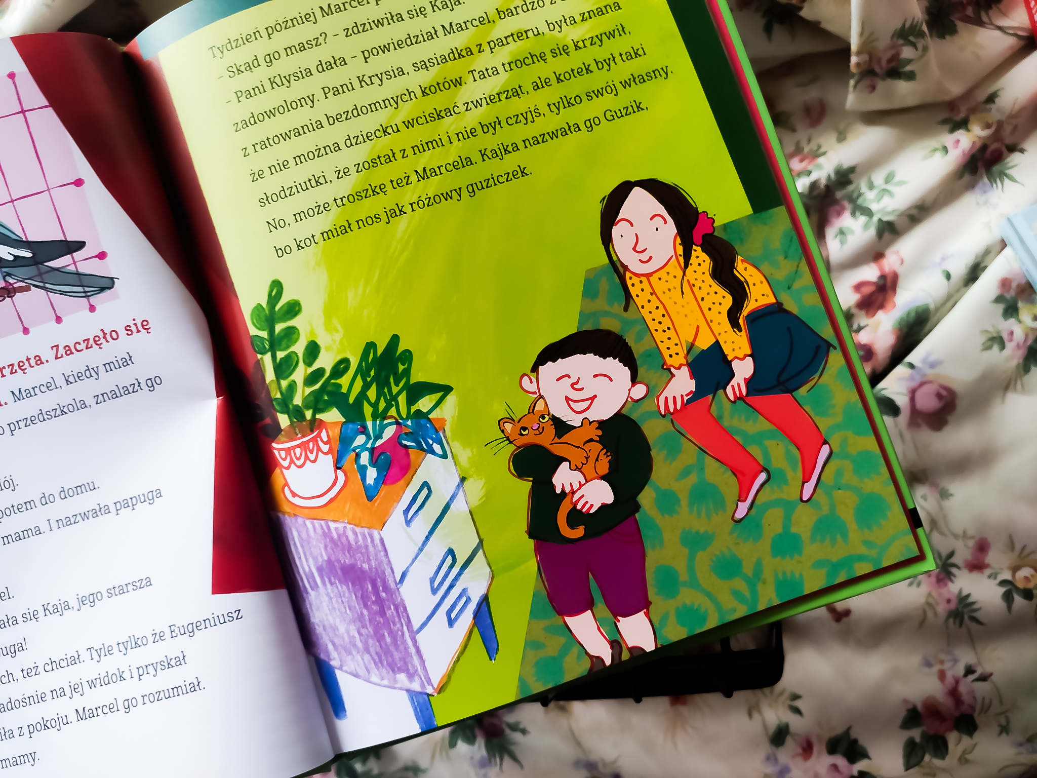 Marcel to chłopak, który kocha zwierzęta całym sercem. Nie jest mu obojętny ich los. Mieszkają z nim już papuga, dwa koty oraz jamnik, który nie do końca jest rasowy. Czy w domu znajdzie się miejsce dla nowych, zwierzęcych przyjaciół? Ja sama przy lekturze tej książki niesamowicie się wzruszyłam. Marcel to chłopczyk, który kocha swoich przyjaciół i nie jest nieczuły na ich krzywdę. Autorka nie boi się „wprowadzić na scenę” trudnych emocji jak ból w przypadku straty przyjaciela czy niezwykłą determinację, aby go ratować. Ta książeczka jest trudna, ale i dobra dla dzieci, bo pokazuje, że nie warto unikać cierpienia tych najbardziej bezbronnych.