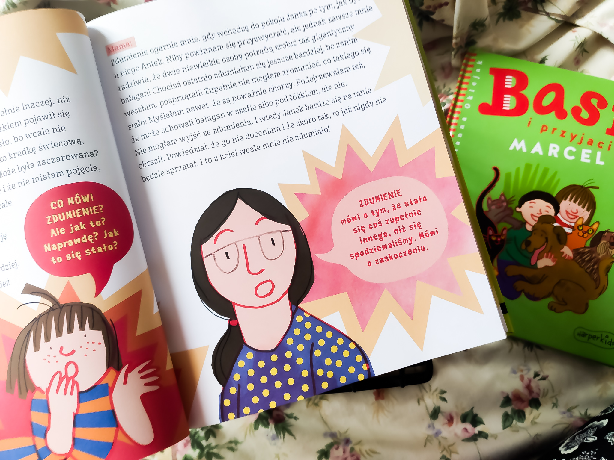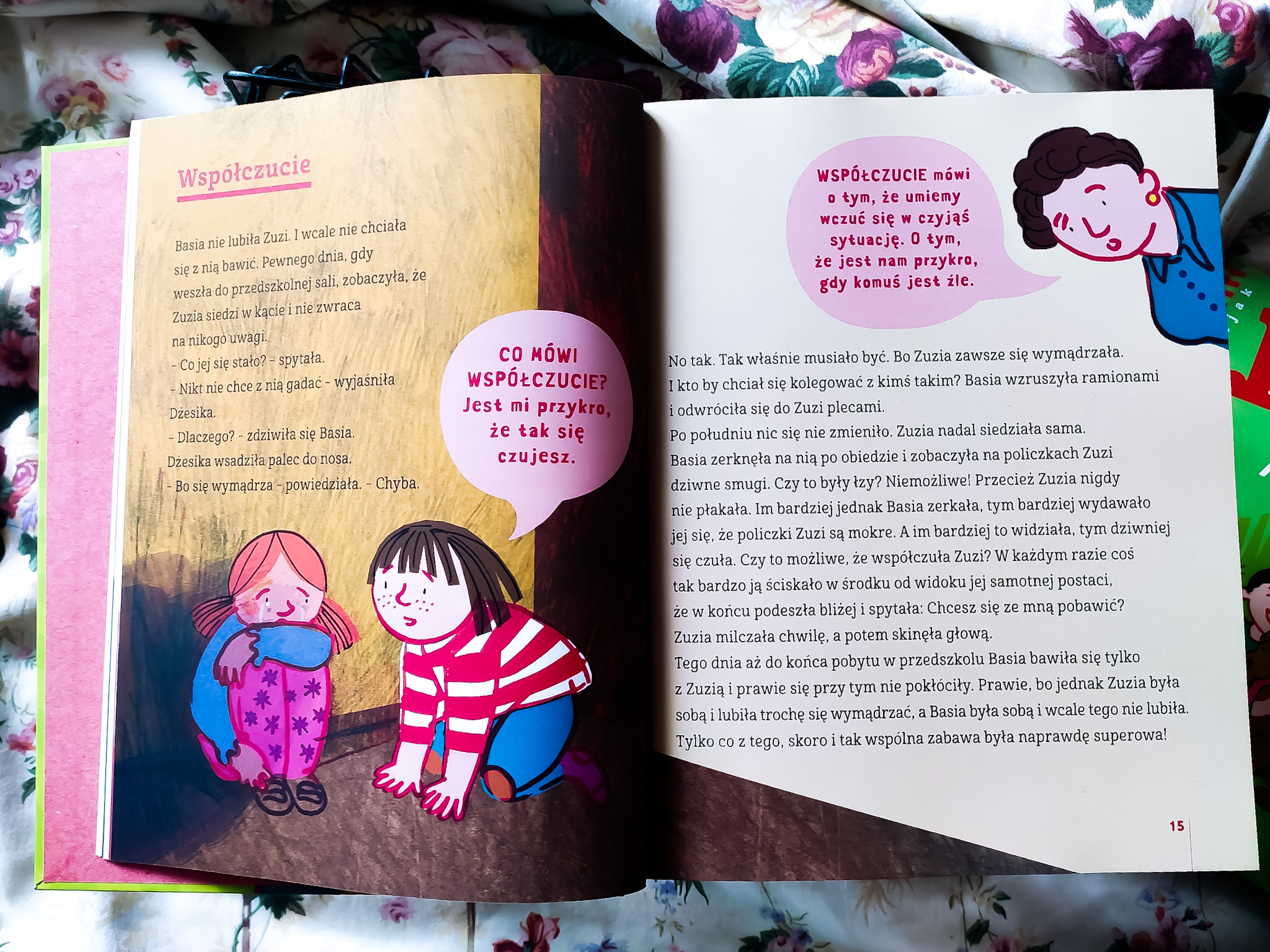 Razem z Basią poznajemy emocje. Jakie? Empatie, współczucie, odwagę, stres, strach, lęk, wściekłość, wzruszenie zachwyt – to tylko kilka, na których autorka skupiła się w swojej najnowszej książce. Każde uczucie jest bardzo dokładnie i ciekawie opisane. Nie przy wszystkim, ale przy większości, znajduje się krótka historyjka, która ma za zadanie zobrazować sytuację, w której pojawia się dana emocja. Co więcej, co jest bardzo fajne, autorka zamieściła wypowiedzi Miśka Zdziśka, najlepszego przyjaciela Basi, a także pani Marty, Janka, taty, mamy, dziadka. Ogólnie mówiąc, wszystkich tych, którzy pojawiają się w życiu tytułowej bohaterki i odgrywają w nim jakąś istotną rolę.