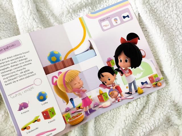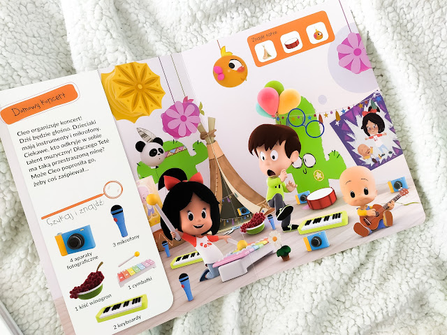 Cleo i Cuquin a tropie. Szukaj i znajdź to książeczka, która spodoba się nie tylko fanom animacji, ale także i tym, którzy kochają wszelakie wyszukiwani. Wraz z bohaterami wybierzemy się na plażę, będziemy organizować Halloween, będziemy myć zęby, wykonamy darmowy koncert i będziemy szukać przygód. Każda rozkładówka to inne miejsce, inne przedmioty do wyszukania i inna historyjka, dzięki czemu dziecko nie znudzi się lekturę. Jakie są plusy z „czytania” takich książeczek? A tutaj autorzy zadbali nie tylko o kolory, ale o liczby, co zarówno mi, jak i synowi niezmiernie się spodobało. Dlaczego? Na każdej stronie mamy różne liczny przedmiotów – maluch szukając i licząc je, widzi jaka jest różnica pomiędzy trzy a cztery, a takie powtarzanie wpływa na to, że szybciej zapamięta i opanuje podstawowe liczenie. Dodatkowo mały czytelnik ćwiczy spostrzegawczość, odróżnia kształty, poznaje nowe słowa. „Cleo i Cuquin a tropie. Szukaj i znajdź” to ksią