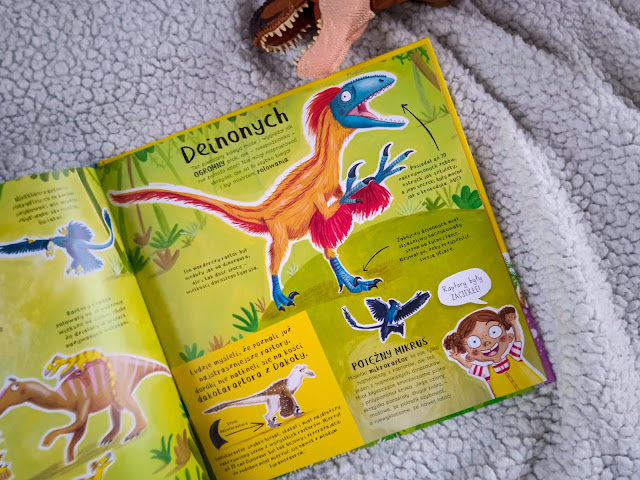 Autor na pierwszych stronach przedstawił informacje, które trzeba przyswoić, zanim zagłębimy się w lekturę. Na kolejnych rozkładówkach poznamy roślinożerców, gigantów i mięsożerców, a tyranozaur (który jest uwielbiany przez dzieci) dostał całą stronę! Wszystkie ciekawostki są podane w interesujący sposób – niekiedy tekst jest pogrubiony, niektóre treści umieszczone są w ramkach. Nie zabrakło również zabawnych anegdotek i komiksowych wstawek. Czy wiedzieliście, że po ziemi chodziły dinozaury kaczodziobe? Albo, że pancerozaury, czyli ankylozaury czy stegozaury, były bardzo trudnym przeciwnikiem dla drapieżców, przez swoje kolce czy rogi? Niektóre informacje zaskoczą nawet najbardziej wymagających małych znawców prehistorycznych gadów! Niemal zapomniałabym wspomnieć o dromeozoarach – małych, ale niesamowicie groźnych!